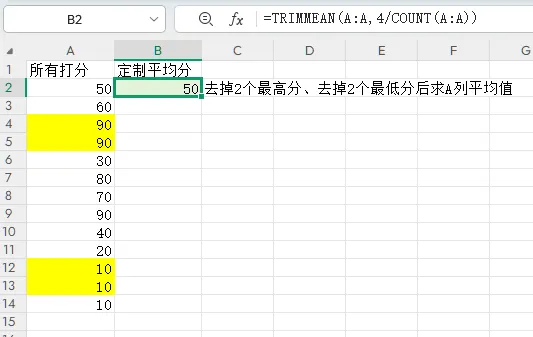 假设最终成绩的评分规则是:去掉两个最高分,去掉两个最低分,然后求平均分,如图1所示。先把所有收集到的分数写入A列,在B2中输入公式=TRIMMEAN(A:A,4/COUNT(A:A))即可自动计算出最终分数。