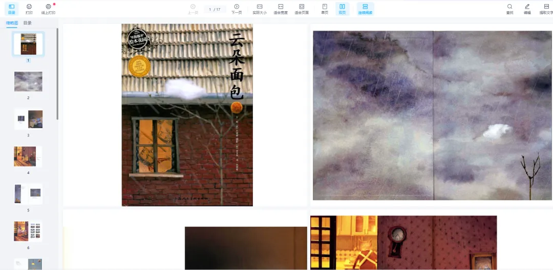 绘本阅读是幼儿教育的重要方式,但许多家长因孩子不识字或价格高而忽视其价值。实际上,绘本通过图文结合能同时刺激儿童的视觉和语言发展。优质绘本能提升儿童的认知、语言和社交能力。长期阅读对学业发展和亲子关系都有积极影响。绘本既是学习工具,也是亲子互动的桥梁。绘本PPT通过丰富多彩的故事和生动的画面,激发幼儿园儿童的学习兴趣,培养他们的阅读能力、想象力和创造力。 绘本PPT电子版画册涵盖了各种主题和风格,包括寓言故事、科普知识、生活常识、人际交往等方面,满足不同年龄段儿童的阅读需求。这些绘本不仅具有丰富的故事情节和精美的插图,还注重文字表达简洁易懂,适合幼儿园儿童阅读和理解。讲述了一个关于爱和美食的故事。清晨的一场雨后,一朵小云挂在了树梢上,孩子们很好奇。他们小心翼翼地把小云朵捧回家。妈妈将小小的云放进碗里,倒入热牛奶和水,放入酵母、盐、糖,做成了香甜的面包。孩子们吃了面包后发生了神奇的事情......
