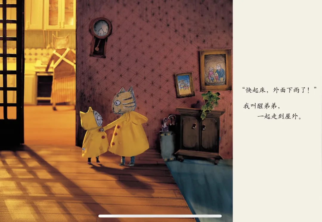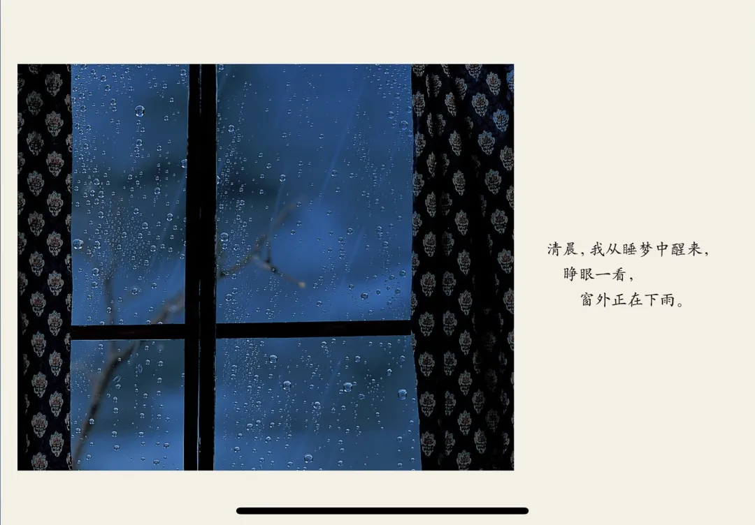 “快起床,外面下雨了!”我叫醒弟弟,一起走到屋外。