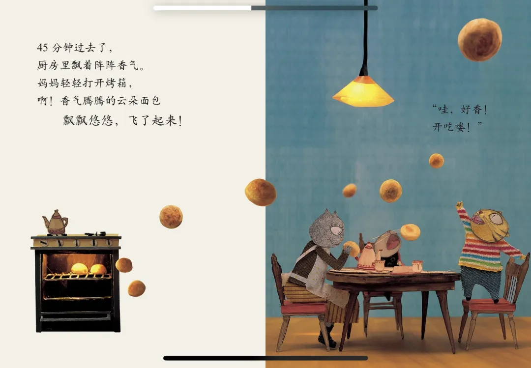 45分钟过去了,厨房里飘着阵阵香气。妈妈轻轻打开烤箱,啊!香气腾腾的云朵面包飘飘悠悠,飞了起来!“哇,好香!开吃喽!”