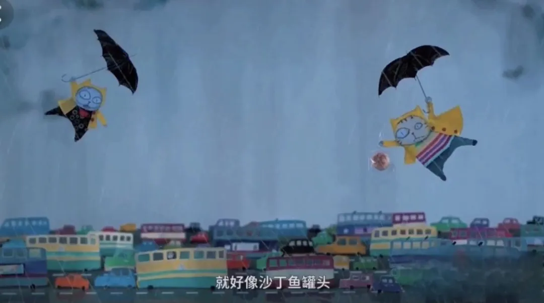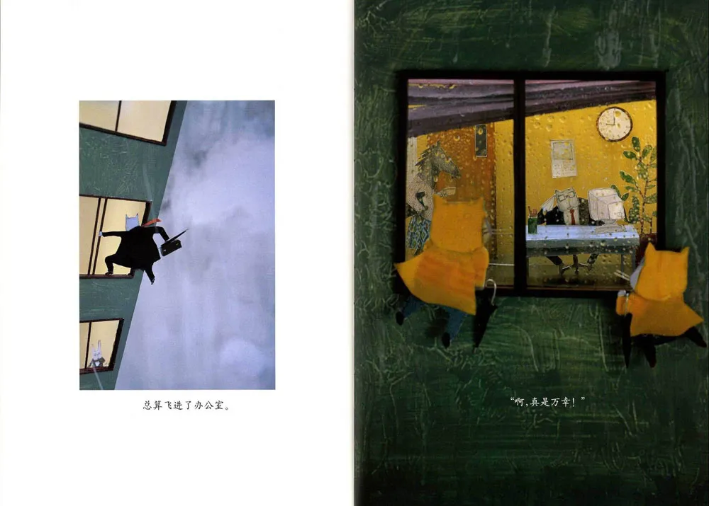 “爸爸一定很饿。”弟弟说。“我们给爸爸送面包去吧。”我把面包装进袋子,打开窗户,和弟弟一起飞上天空。 “爸爸在哪儿呢?他已经到公司了吗?”“不会的啦,看,车都塞在路上了。”