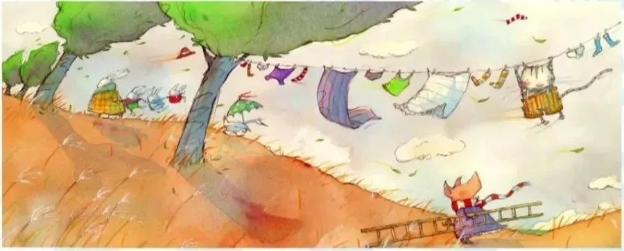 有一天刮起了大风,卡兰巴决定再试一试,他卯足了劲挥动双臂向前飞奔,却被挂到了晾衣绳上。"你在那儿做什么,卡兰巴"?波西亚问。"就是随便荡荡呗",卡兰巴说,"好等我的袜子晾干"。