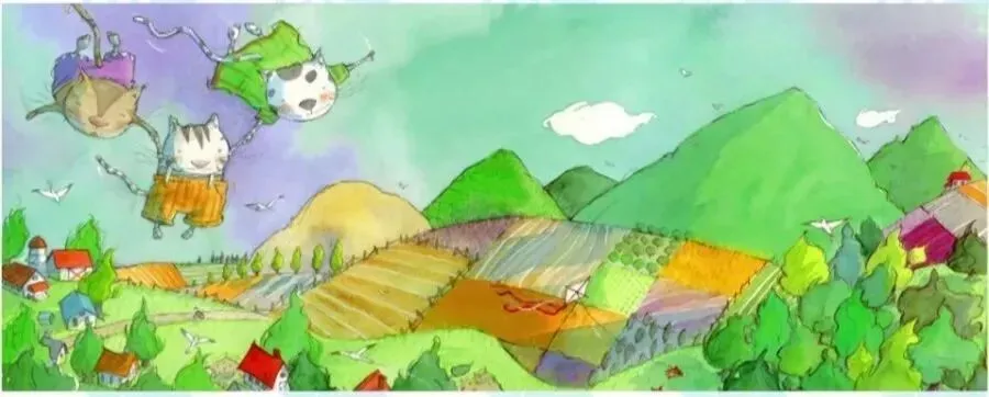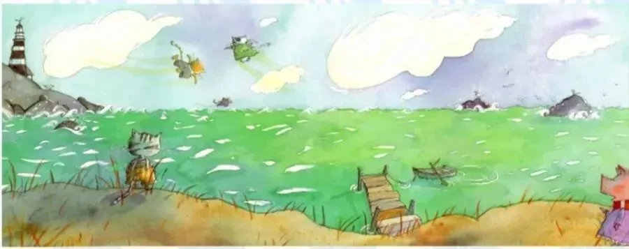 说着,壁球和八哥各自抓起卡兰巴的一只手,他们仨飞上了高空,风,在他们的软毛间钻来钻去,小鸟在他们的身下飞来飞去!卡兰巴睁开双眼,发现自己能看得很远,他被眼前的景象惊呆了。他看见了森林、看见了河流,看见了一幢幢小房子、红色的屋顶,看见了一块块天贴画般的田地,这可真是了不起,太令人震撼了。而此刻大海就在他们的脚下闪闪发光,像一头巨兽翻腾着奔向远方。
