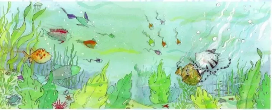 但是就像一块石头,卡兰巴直直的掉进了海底深处,他的身旁环绕着咕咕翻腾的水泡,海草缠住了他的双脚, 他睁开眼睛看见一群群鱼儿正和他面面相觑。螃蟹急匆匆爬过白色的沙地,海胆和海星散发出蓝幽幽的光芒,卡兰巴身上的皮毛在海水中轻轻摆动,接着他浮起来了。