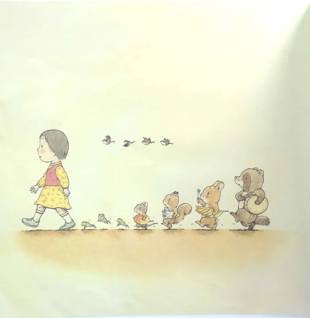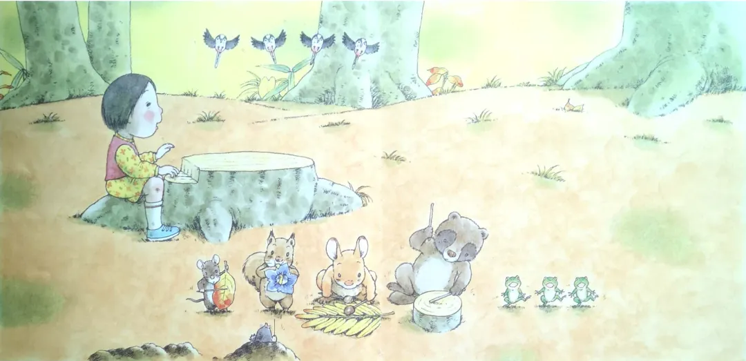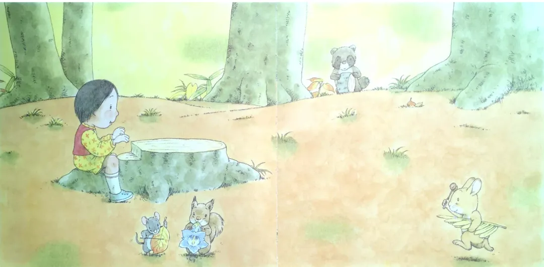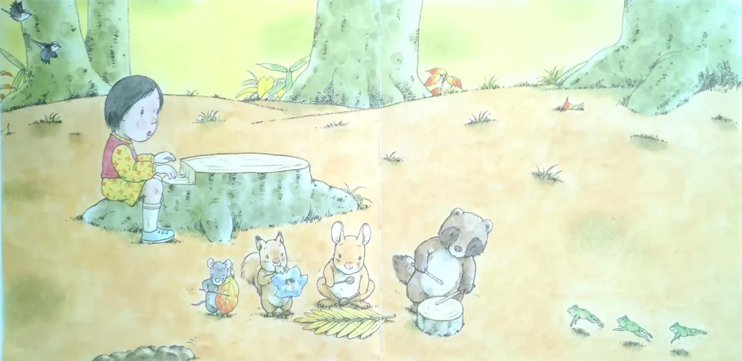 讲述了一名小女孩在森林中以树桩、树叶、喇叭花等自然物品当作乐器,弹奏出美妙的音乐。小老鼠、小松鼠、小兔子等小动物被音乐吸引,纷纷前来聆听,随后也加入其中,共同开启了一场欢乐的“大森林音乐会”。故事洋溢着大自然的清新气息,展现了人与动物和谐共处的美好场景。