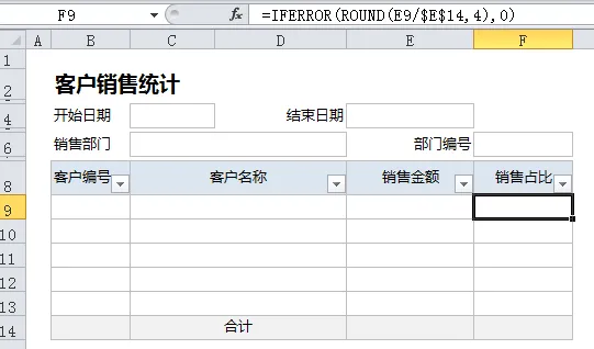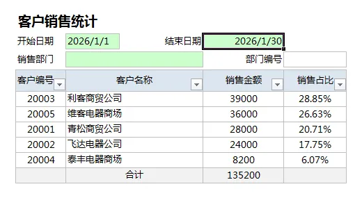 明细表里有“客户编号”“客户名称”“销售金额”“销售占比”四列,其中前三列是从销售单取数据,“销售占比”中使用了Excel公式,用每个客户的销售金额除以总销售金额来计算每个客户的销售占比。