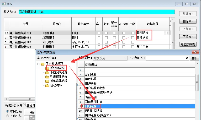 主表中的字段需要添加数据规范, 其中,“开始日期”,“结束日期”使用的是“系统预定义”数据规范中的“日期选择”,销售部门则使用了我们事先定义的列表窗体规范——“部门单选”。