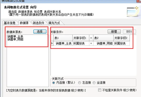 设置完基本信息后,我们再来选择数据源,这儿选“销售单_主表”和“销售单_明细”就可以了,我们可以看到,在设计时,是按模板来进行的,但是应用取数公式时,则是按数据表来取数的,所以数据表也是一个很重要的概念。