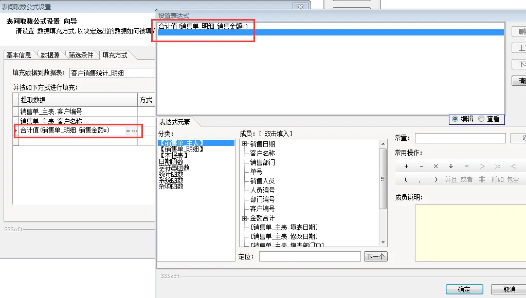下图是销售金额的填充公式,因为要填的是合计值,所以要先在左边的窗口中选择相应的函数,再把要合计的金额字段填进去就可以了。