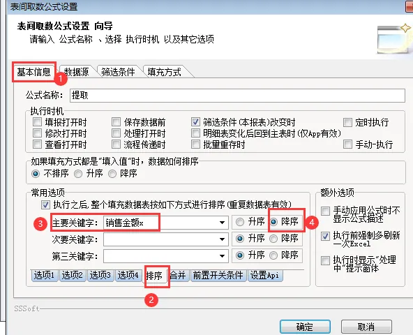 这样,这个表间公式,就基本完成了,因为我们想在提到统计数据时,对客户按销售额从高到低进行排列,所以最后我们还要回到基本信息的选项,对数据做一下排序设置。