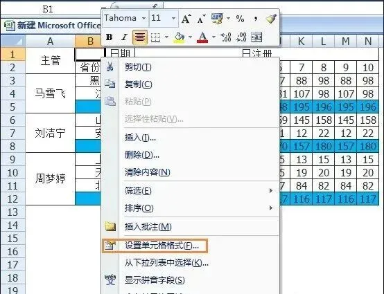 2、如上图可知,四个单元格没有合并,我们要给单元格B1和C2各画一条斜线。首先,选中B1,右键,在下拉菜单中选择【设置单元格格式】。