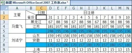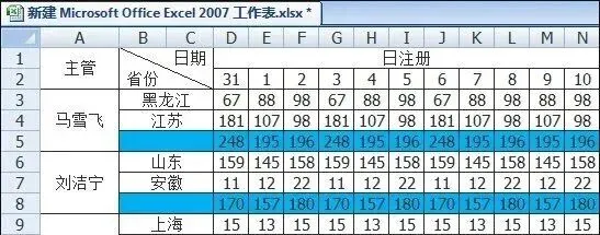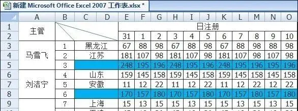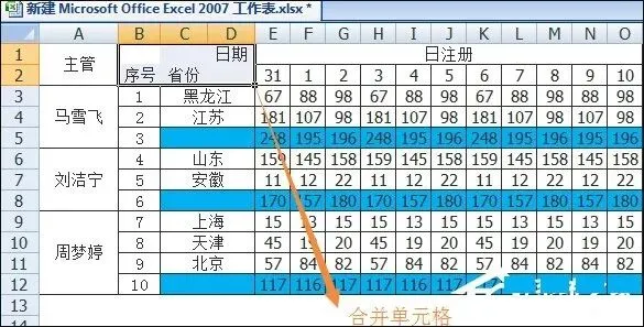 7、如图,先选中B1,B2,C1,C2,D1,D2,E1,E2这几个单元格,并合并之。