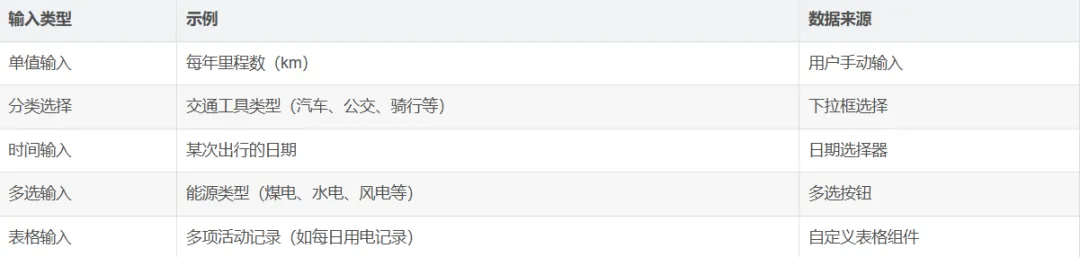 在碳足迹计算中,用户输入通常包含多个维度的数据,如交通工具类型、使用频率、能源种类、碳排放系数等。