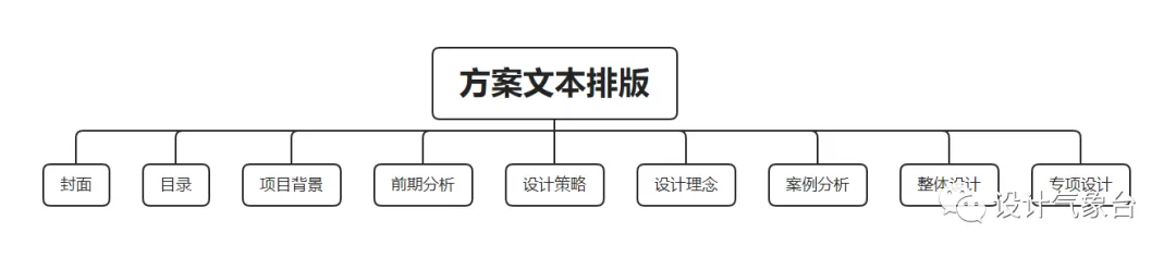 梳理清晰大逻辑之后,接下来就开始制作各部分内容。一个完整的方案文本应包含:封面、目录、项目背景、前期分析、设计策略、设计理念、案例分析、整体设计、专项设计等。