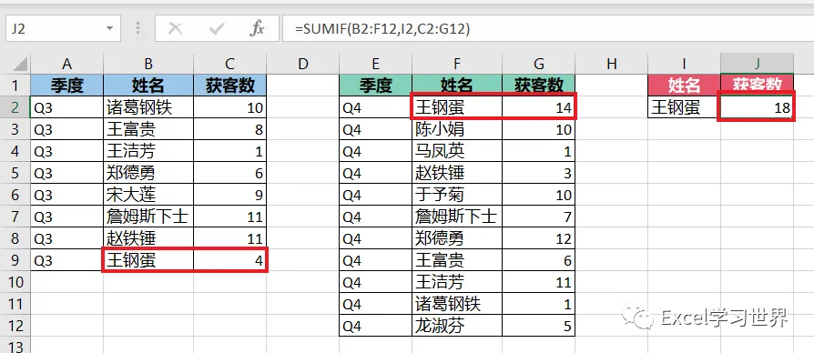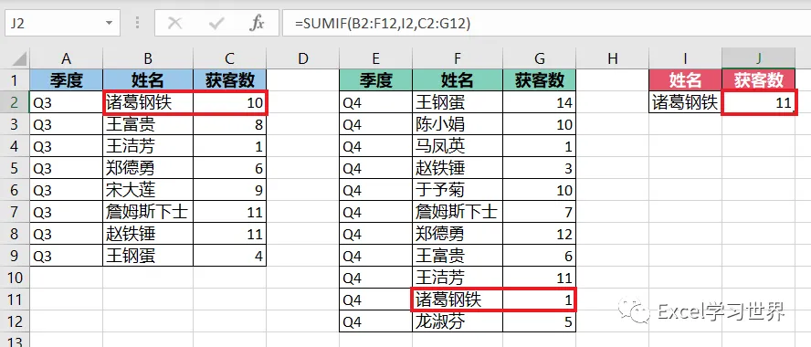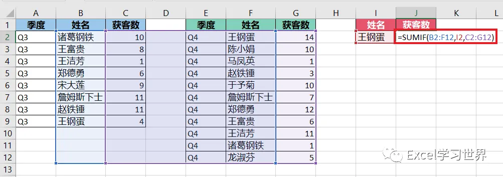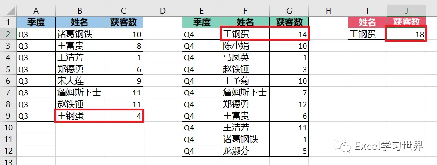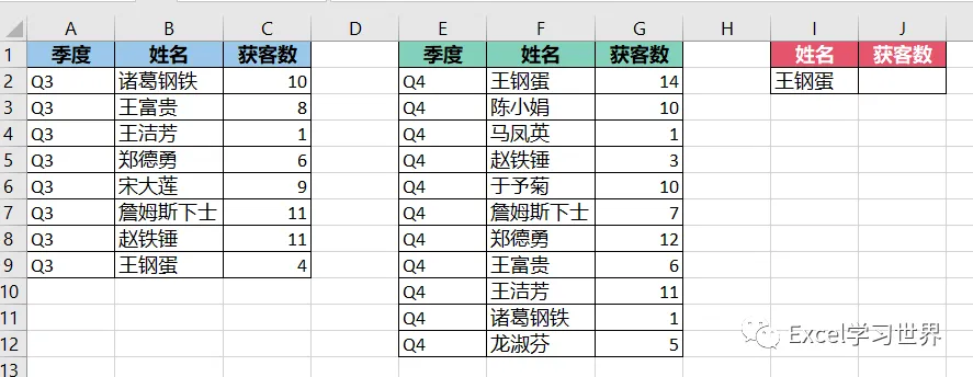 下图 1 中蓝、绿两个表分别是部分员工三季度和四季度的获客数列表,请根据红色表格中列出的姓名,计算出相关人员的总获客数。