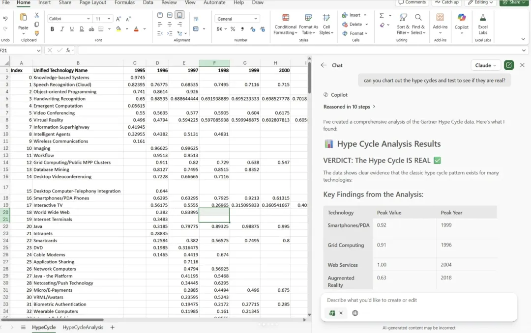 同样是在 Excel 里用 AI,Claude 的表现明显优于微软自家的 Excel Agent,原因不在模型大小,而在设计哲学。微软的思路是“Excel 是中心”,AI 的任务是更聪明地调用 Excel 现有功能;Claude 的思路是“结果是中心”,Excel 只是一个承载数据和结果的界面。