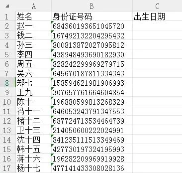 如下图,B列是 18 位身份证号码,需要从中提取出生日期。身份证号的 第 7 位到第 14 位 就是出生日期。- 在 C2 单元格手动输入 B2 的出生日期,例如: 19365104