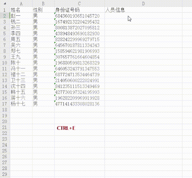 Excel 会自动按照你在 D2 做的“示例格式”,把下面所有行的姓名、性别、身份证号都自动合并起来。五、小结