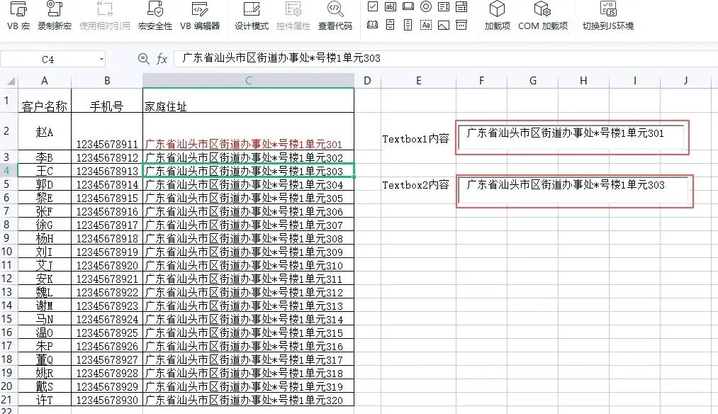 TextBox2.Text = Cells(当前行号, "C") '④文本框2 的内容显示为 当前行号、c列所对应的单元格即C4的内容