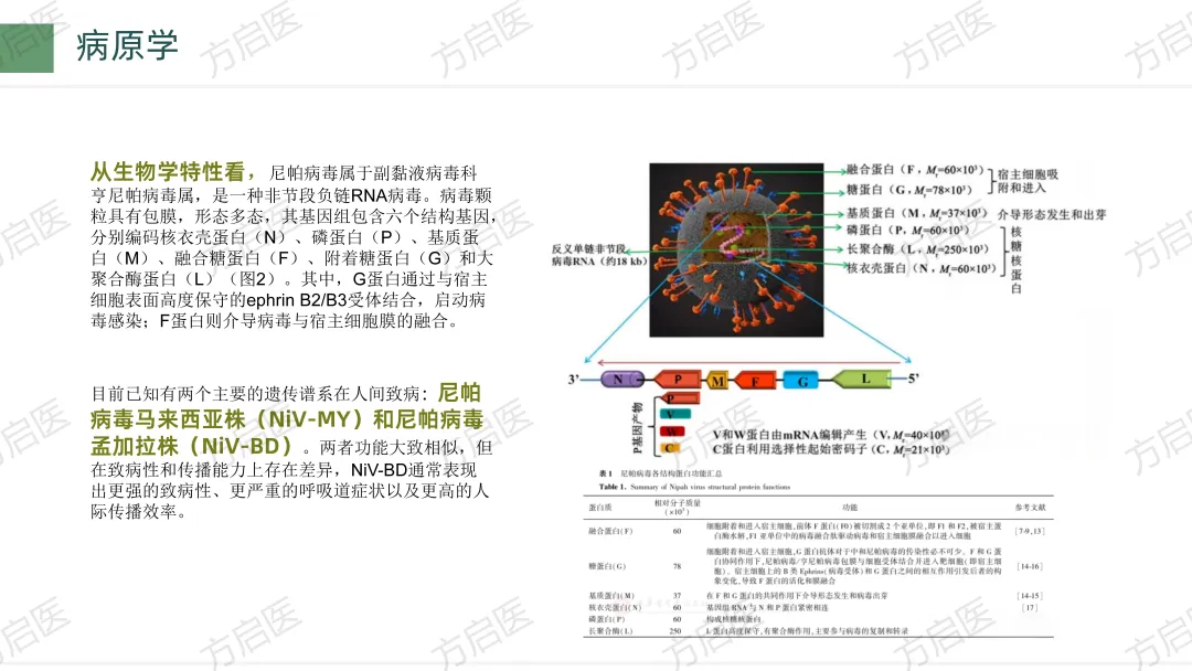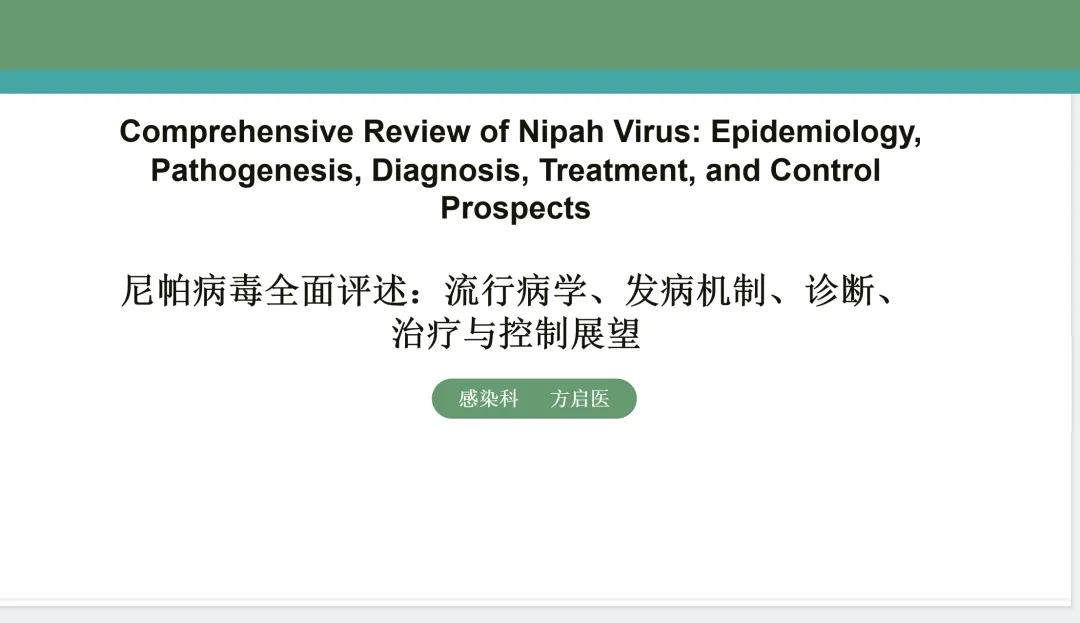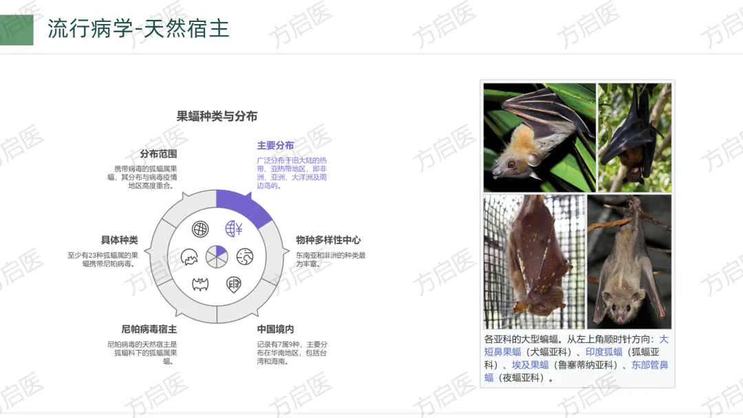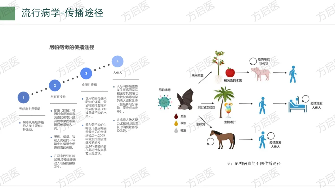 尼帕病毒是一种人畜共患病毒,通常由动物传播给人类,但也可通过受污染的食物或在人与人之间直接传播。