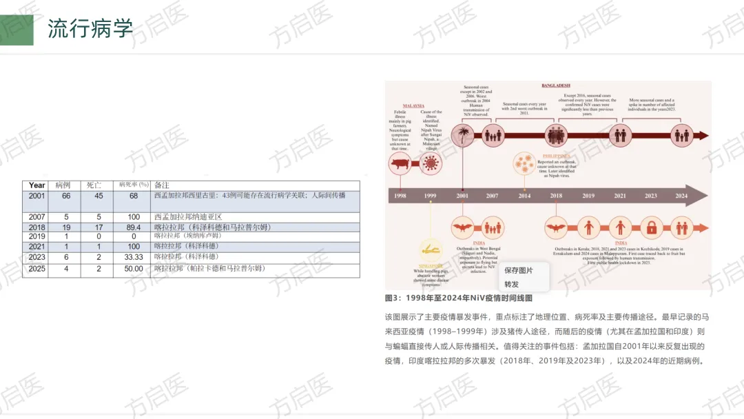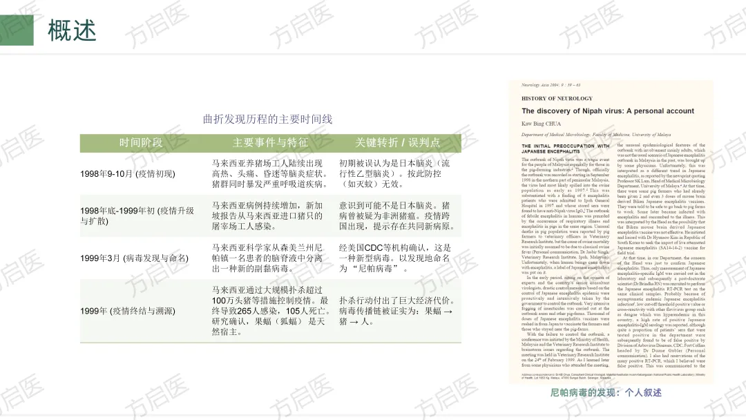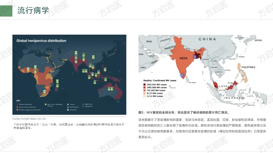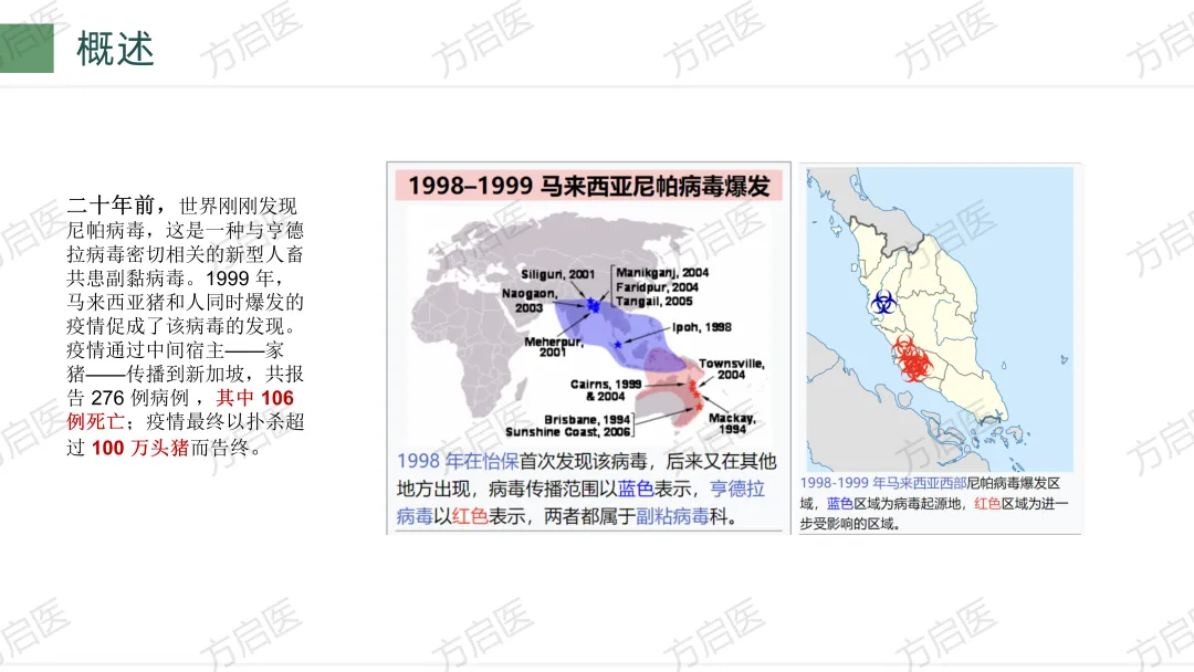 尼帕病毒于1998年在马来西亚养猪户中首次被发现。1999年,新加坡在从马来西亚进口病猪后报告了疫情。自1999年以来,马来西亚和新加坡均未报告新的疫情。