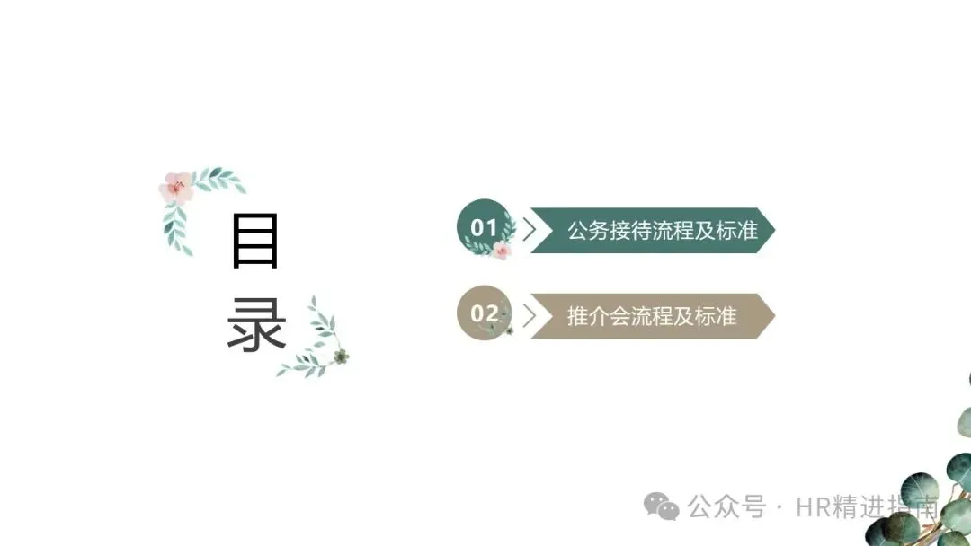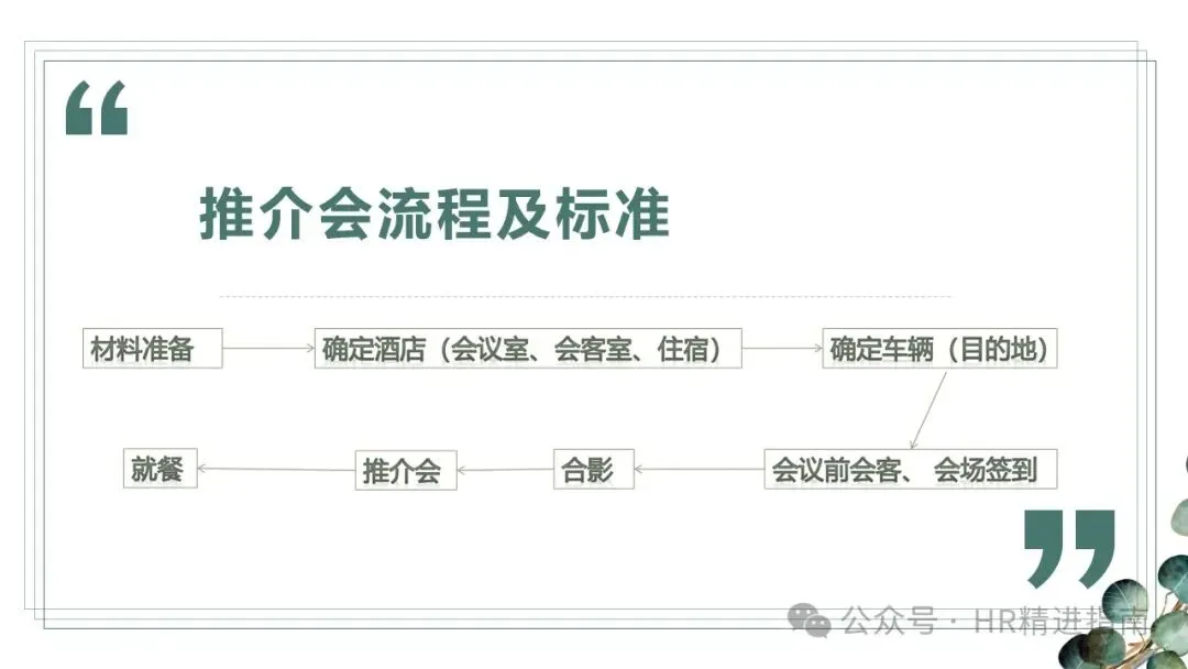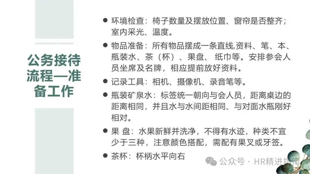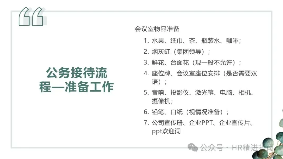 - 基础物资:水果、纸巾、茶叶、瓶装水、咖啡,根据需求准备铅笔、白纸、公司宣传册、企业 PPT 及宣传片;