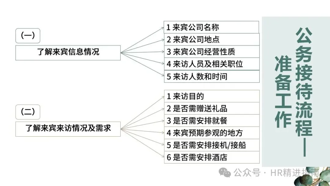 - 前期准备:确定酒店(会议室、会客室、住宿)、车辆及目的地,备好会议材料,安排会前会客与会场签到环节。