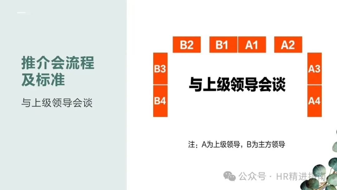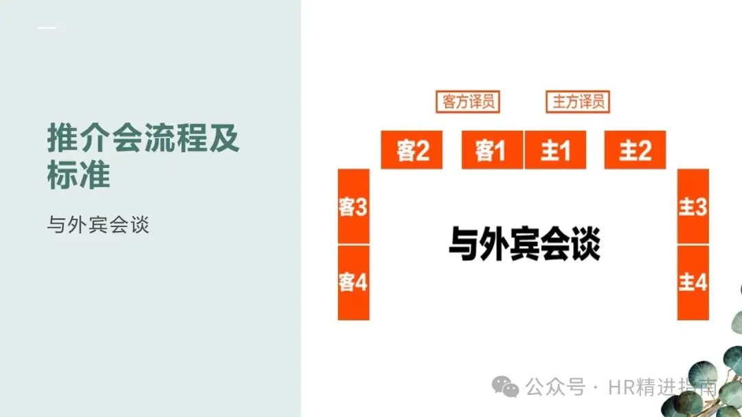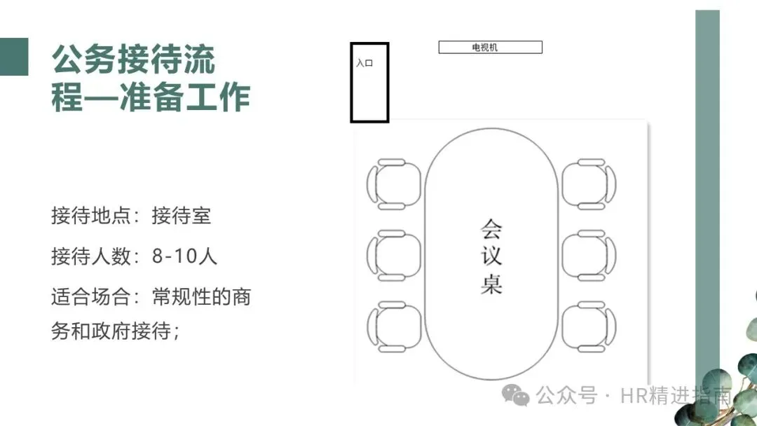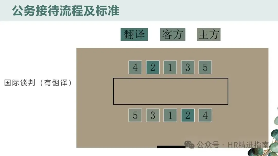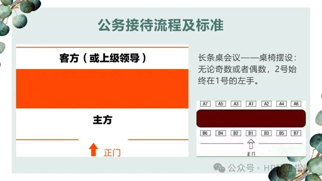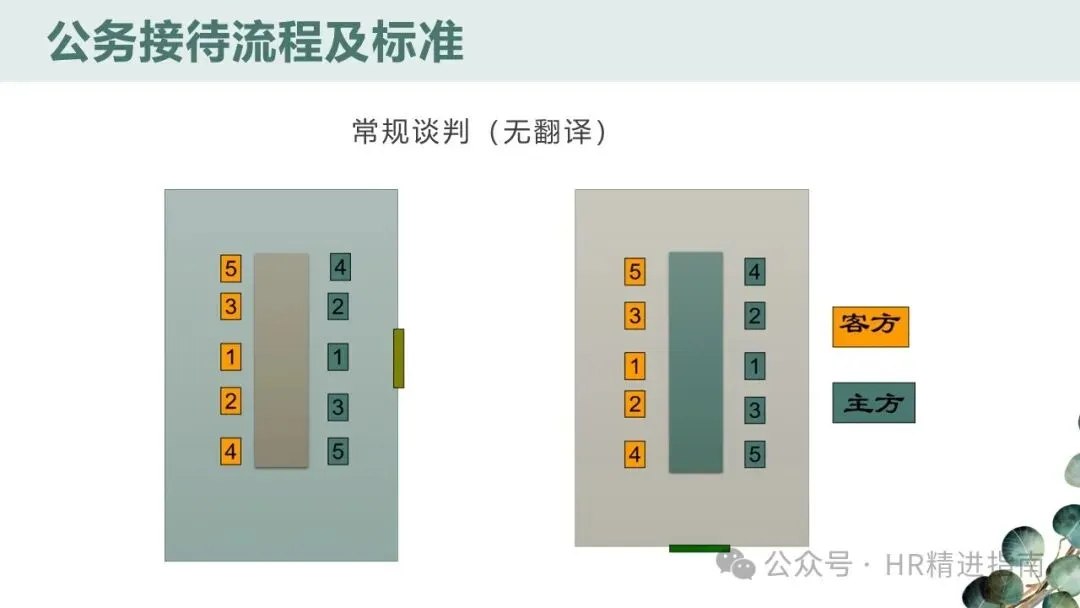 - 长条桌会议:无论人数奇偶,2 号座位始终在 1 号座位左手边,客方坐于正对正门一侧或指定尊贵位置。