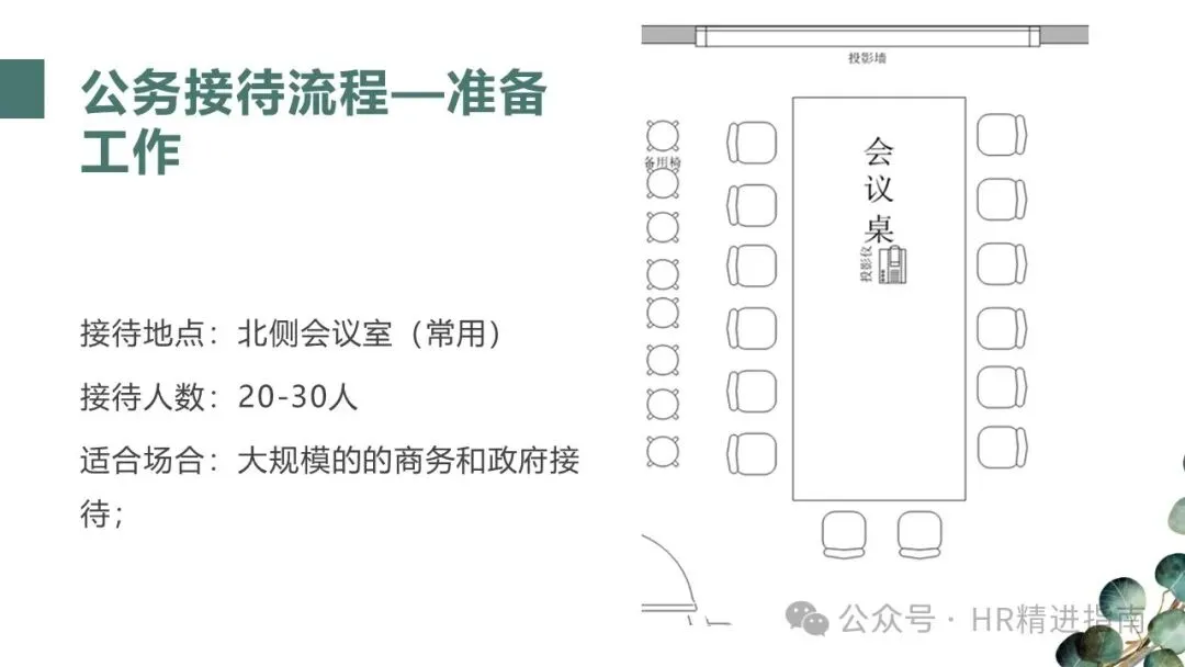 根据接待规模与性质选择合适场地:常规商务或政务接待可选 8-10 人的接待室;20-30 人的大规模活动则适合北侧会议室等空间充足的场地。布置需提前半小时完成,核心要求如下: