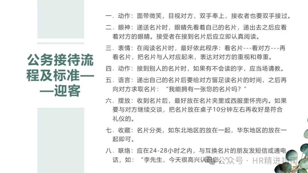 - 名片礼仪:递接均需双手进行,递送时先看名片再注视对方,接收后立即认真阅读,若有生僻字当场请教。递出后留足对方阅读时间,再礼貌求取名片:“我能拥有一张您的名片吗?” 收到的名片可暂时放在桌面(交谈时约 10 分钟),后续分类收藏,24-28 小时内主动联络,如发送问候短信。