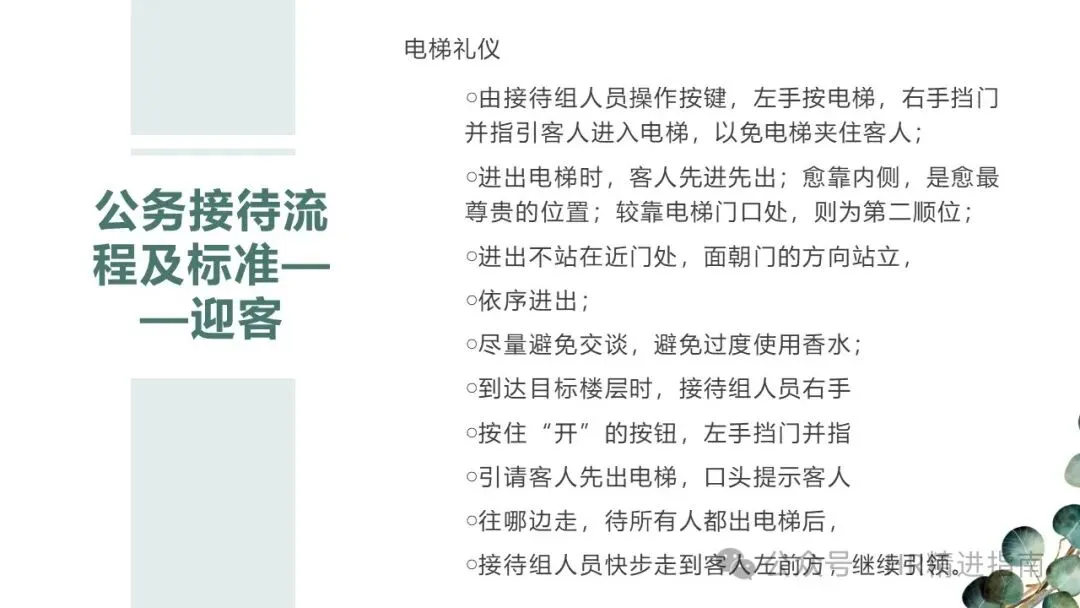 - 电梯礼仪:由接待人员操作按键,左手按电梯、右手挡门引导客人先入;电梯内愈靠内侧位置愈尊贵,接待人员不站近门处,面朝门站立,避免交谈与过度使用香水;到达楼层后,按住 “开” 键挡门,引导客人先出,再快步至左前方继续引领。