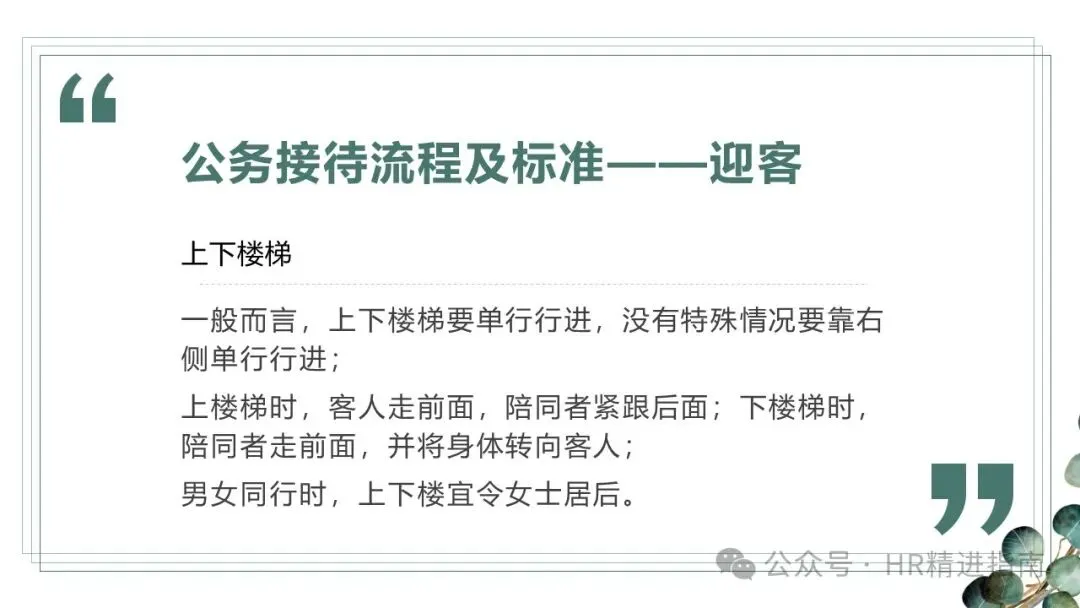 - 上下楼梯:单行靠右行进,上楼梯时客人在前、陪同者在后,下楼梯时陪同者在前并转向客人;男女同行时,女士居后。