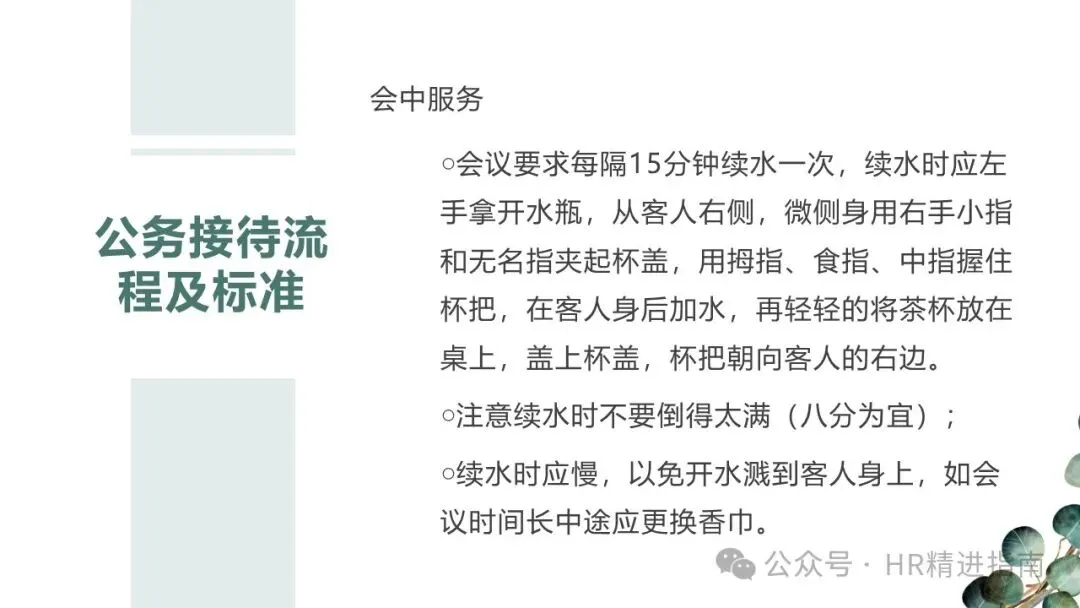 - 会议服务:每隔 15 分钟续水一次,续水时左手拿开水瓶,从客人右侧微侧身,用小指和无名指夹起杯盖,拇指、食指、中指握杯把,在客人身后缓慢加水,盖好杯盖后将杯把复位朝右。会议时间较长时,中途需更换香巾。