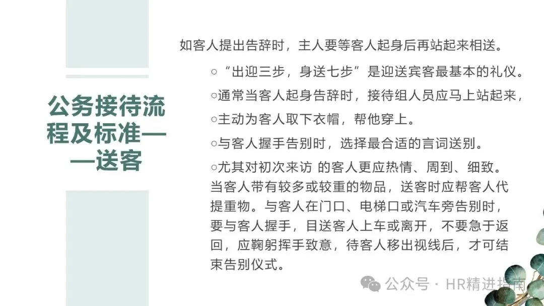 “出迎三步,身送七步”,送客环节的得体与否,直接影响整体接待效果。