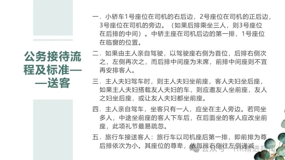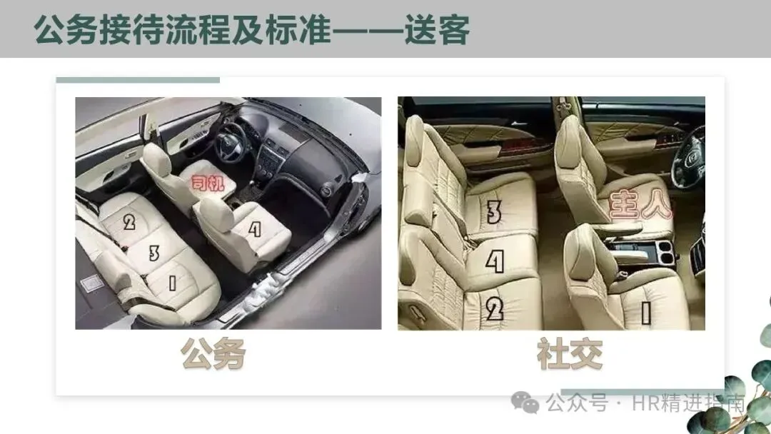 - 特殊情况:主人夫妇驾车时,主人夫妇坐前座,客人夫妇坐后座;搭载友人夫妇时,友人可坐前座或与夫妇同坐前座。主人驾车且仅一位客人时,客人坐主人旁边;多人同乘时,前座客人下车后,后座客人应改坐前座。