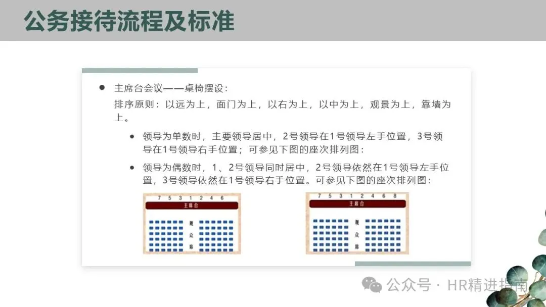 - 主席台会议:领导为单数时,主领导居中,2 号在左手、3 号在右手;领导为偶数时,1、2 号同时居中,2 号仍在 1 号左手,其余依次排列。