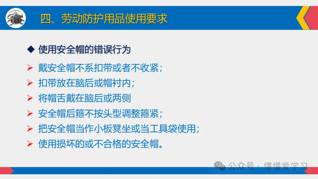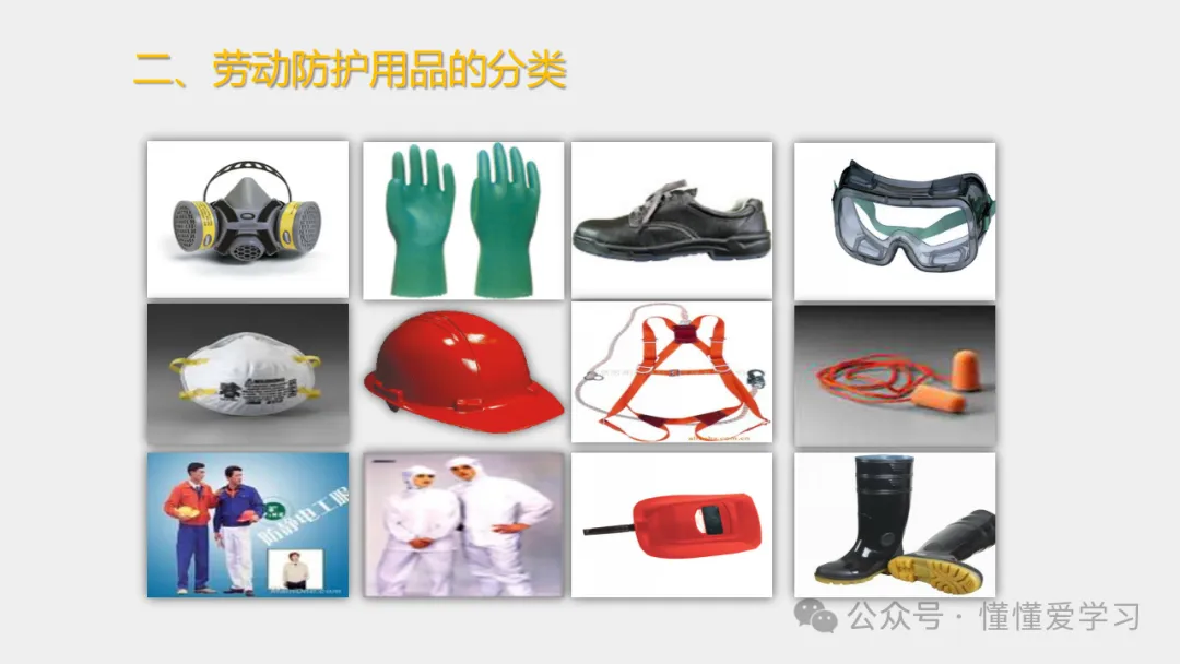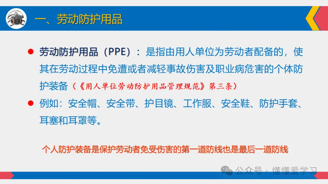 劳动防护用品(PPE)是指由用人单位为劳动者配备的,使其在劳动过程中免遭或者减轻事故伤害及职业病危害的个体防护装备(《用人单位劳动防护用品管理规范》第三条)。例如,安全帽、安全带、护目镜、工作服、安全鞋、防护手套、耳塞和耳罩等。这些个人防护装备是保护劳动者免受伤害的第一道防线,也是最后一道防线。