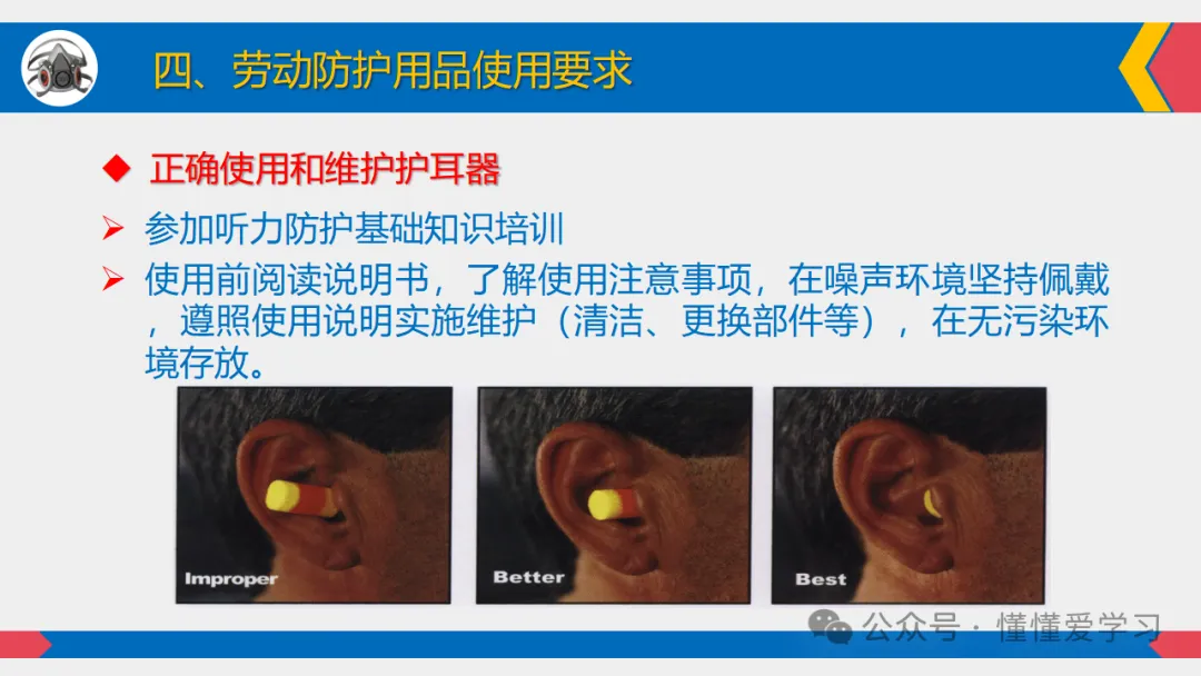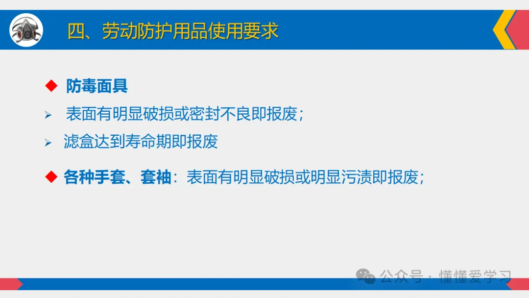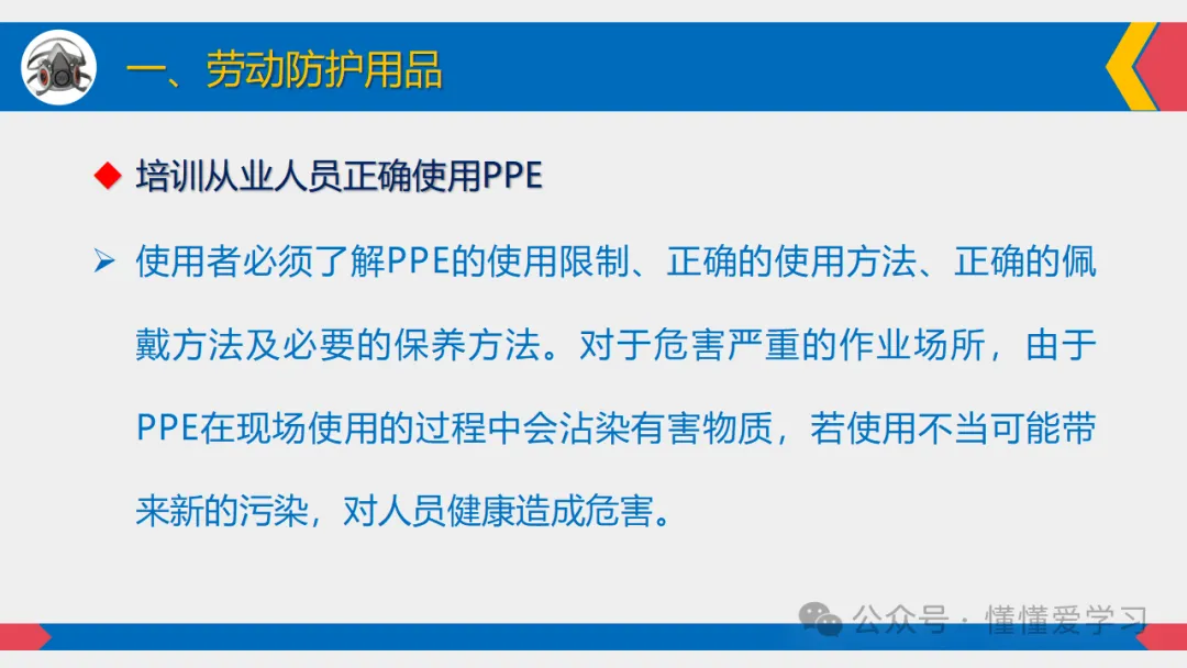 培训从业人员正确使用PPE,使用者必须了解PPE的使用限制、正确的使用方法、正确的佩戴方法及必要的保养方法。对于危害严重的作业场所,由于PPE在现场使用的过程中会沾染有害物质,若使用不当可能带来新的污染,对人员健康造成危害。