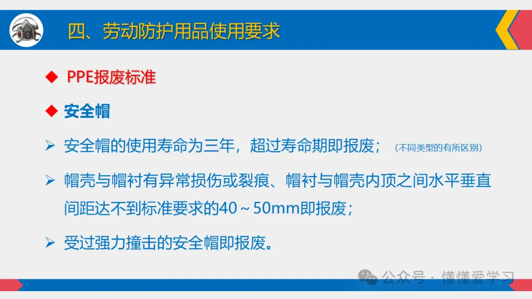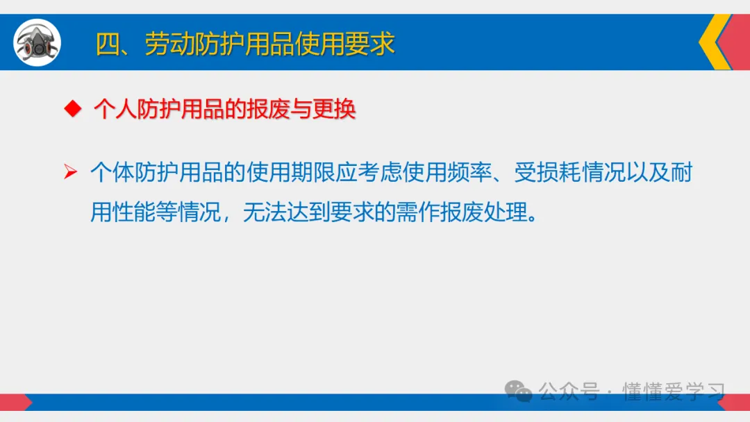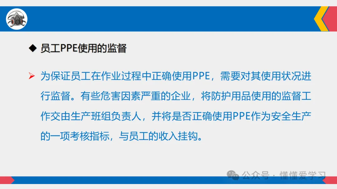 为保证员工在作业过程中正确使用PPE,需要对其使用状况进行监督。有些危害因素严重的企业,将防护用品使用的监督工作交由生产班组负责人,并将是否正确使用PPE作为安全生产的一项考核指标,与员工的收入挂钩。