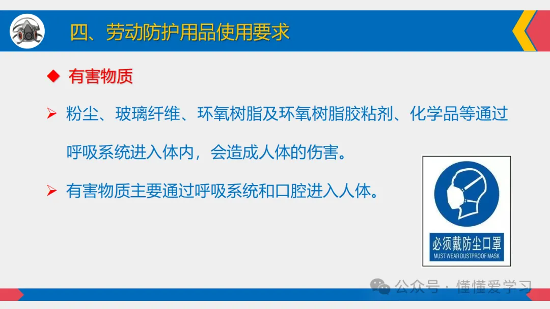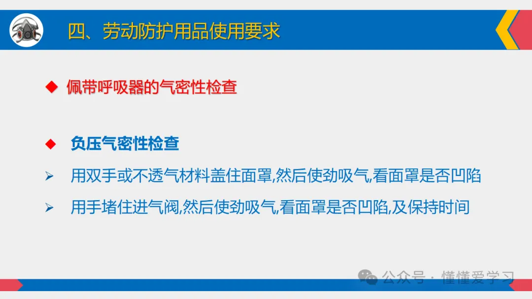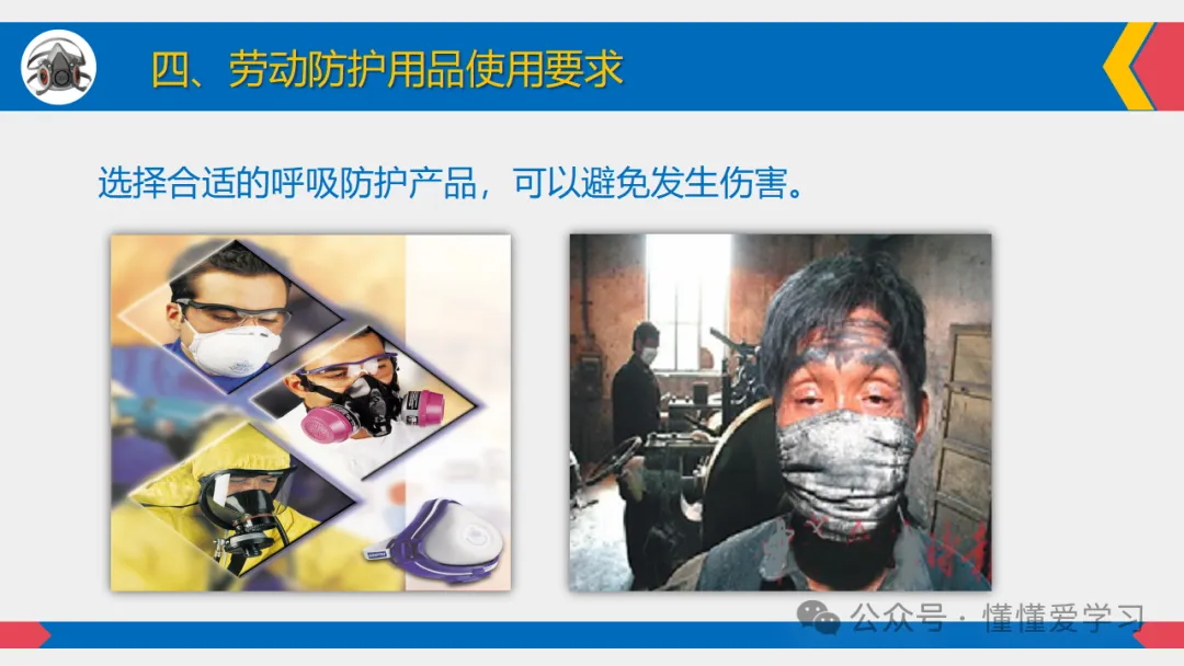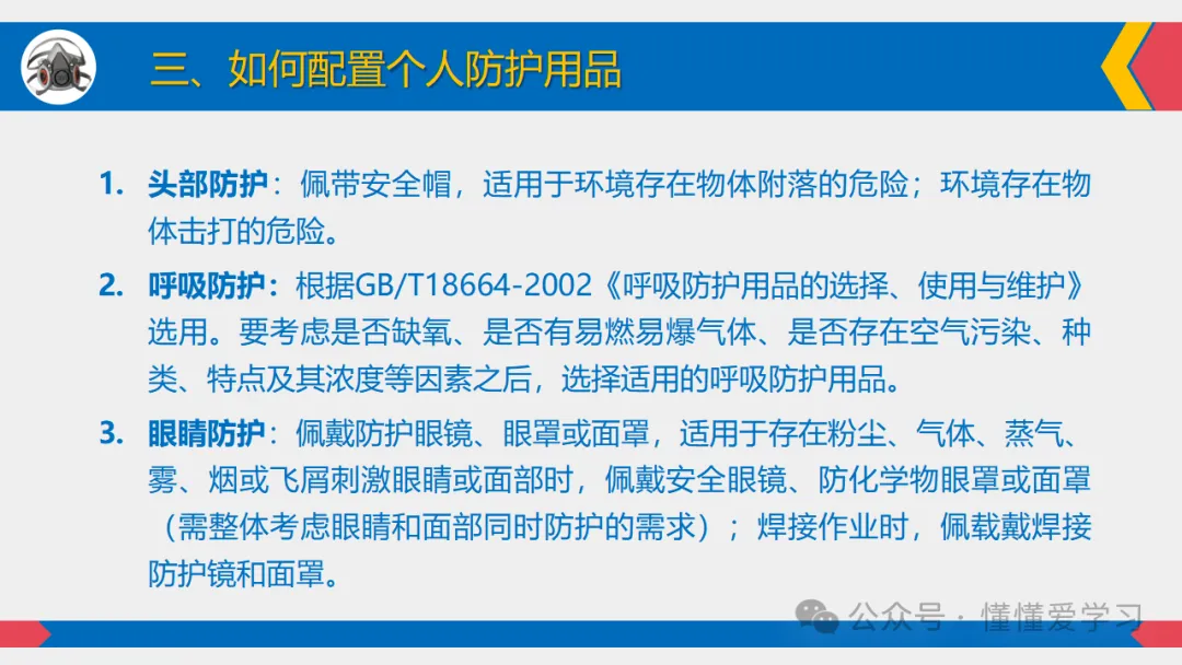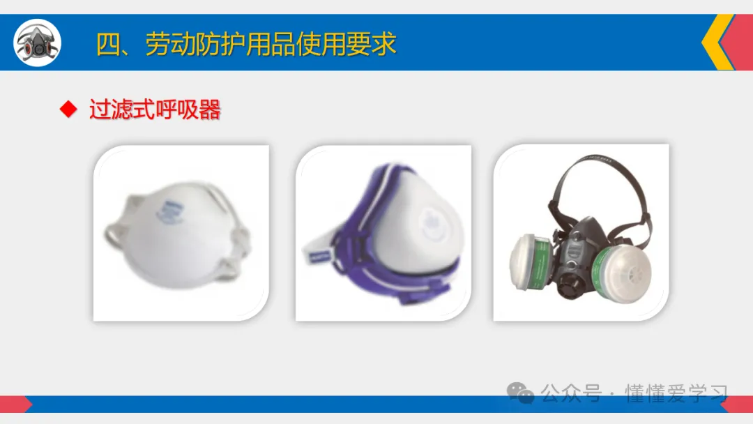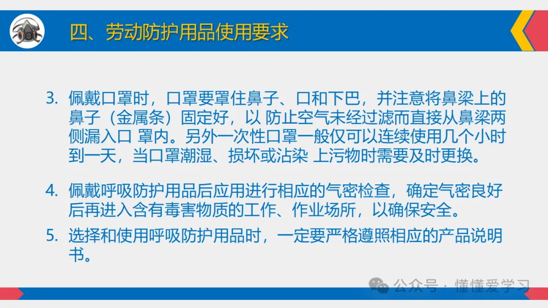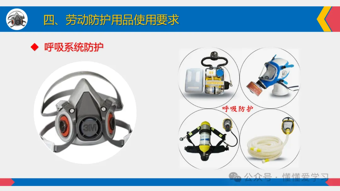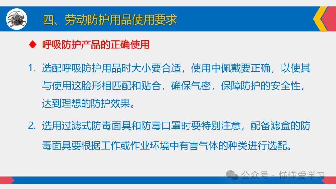 呼吸防护用品用于防御缺氧空气和空气污染物进入呼吸道。根据GB/T18664-2002《呼吸防护用品的选择、使用与维护》,用人单位在选用呼吸防护用品时,需考虑是否缺氧、是否有易燃易爆气体、是否存在空气污染、种类、特点及其浓度等因素,以选择适用的呼吸防护用品。
