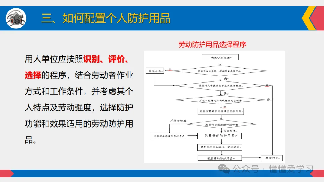 用人单位应按照识别、评价、选择的程序,结合劳动者作业方式和工作条件,并考虑其个人特点及劳动强度,选择防护功能和效果适用的劳动防护用品。