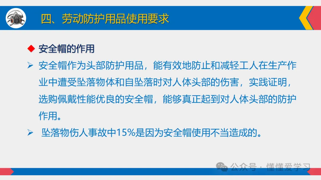 头部防护用品用于防御物理、化学和生物危险、有害因素对头部的伤害。例如,安全帽是头部防护用品的常见类型,它能有效防止和减轻工人在生产作业中遭受坠落物体和自坠落时对人体头部的伤害。