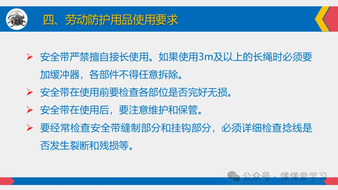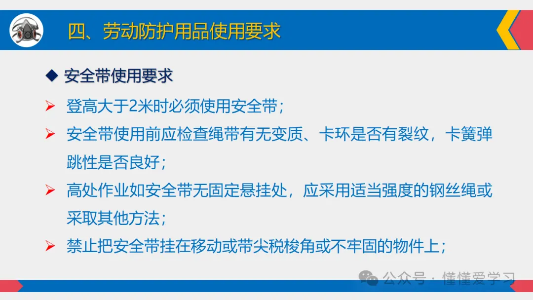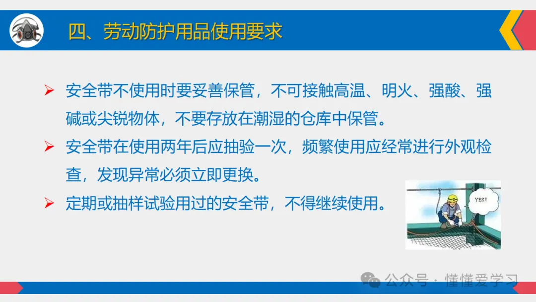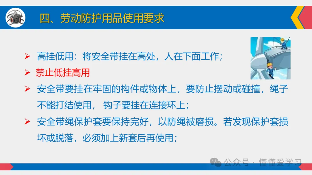 坠落防护用品用于防止高处作业劳动者坠落或者高处落物伤害。例如,安全带是坠落防护用品的常见类型,适用于需要登高时(2米以上)或有跌落危险的作业环境。