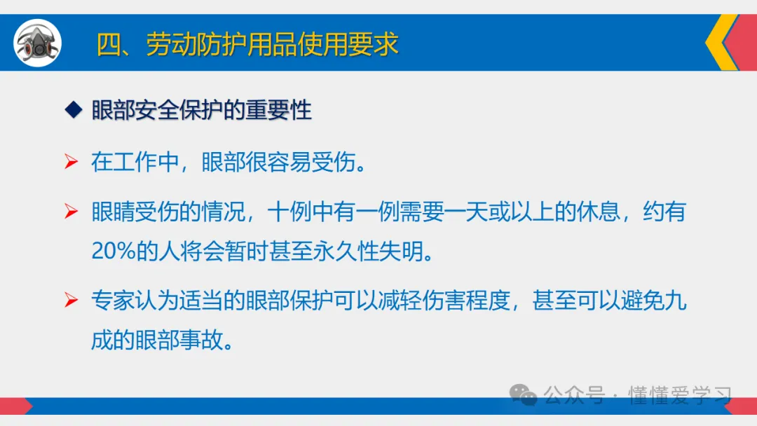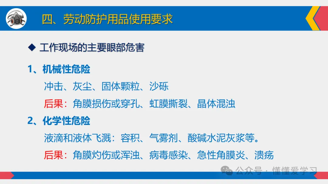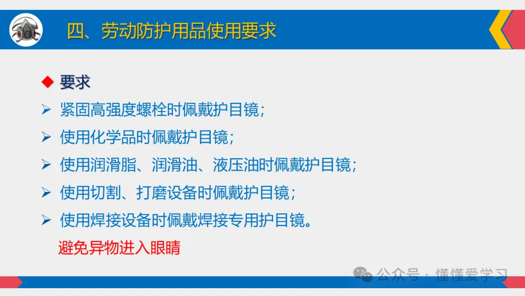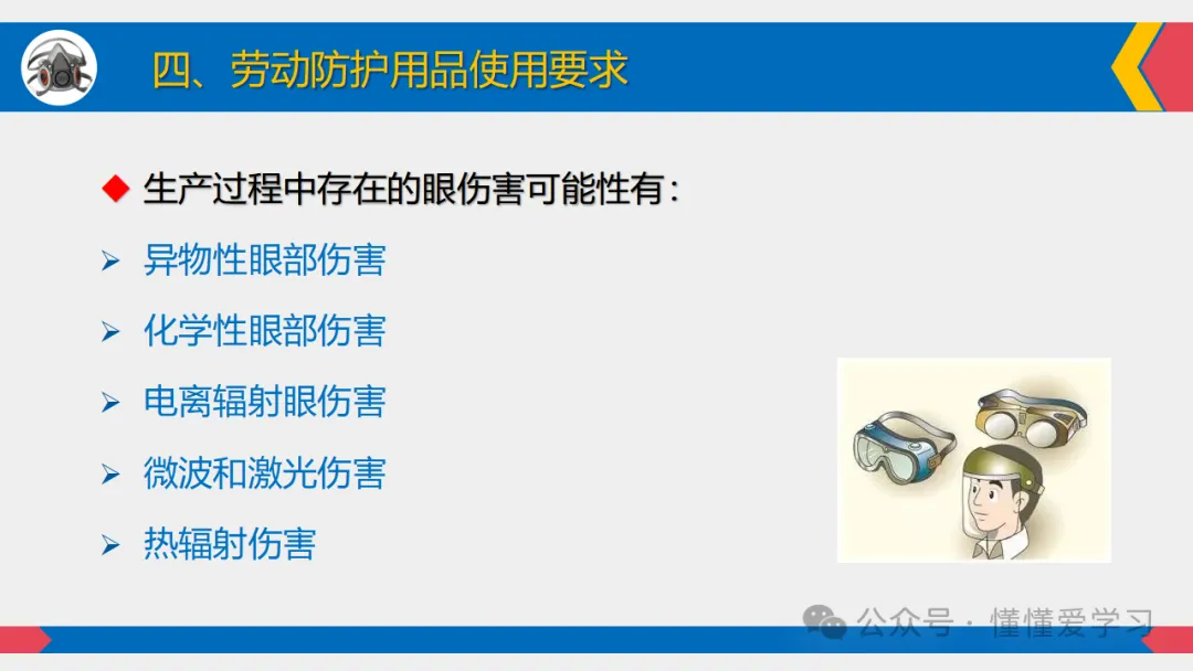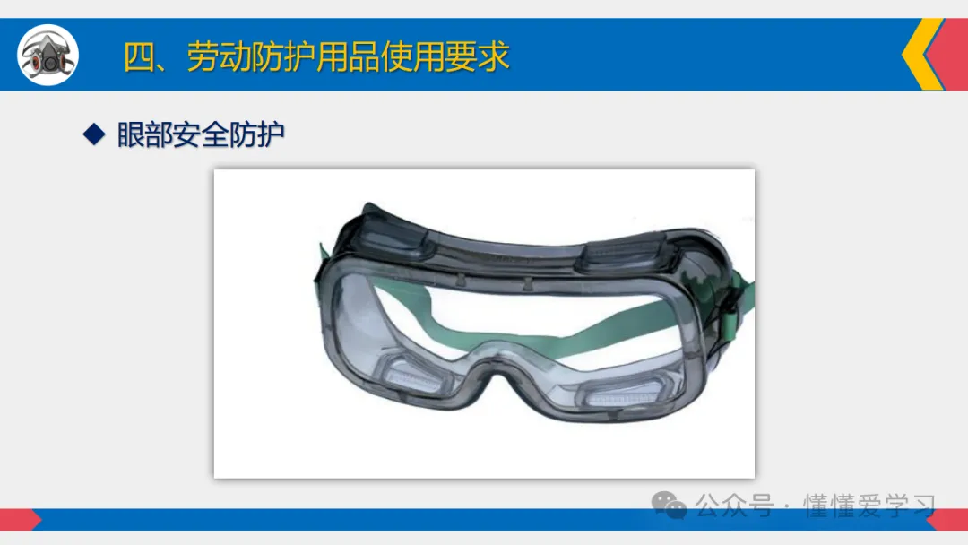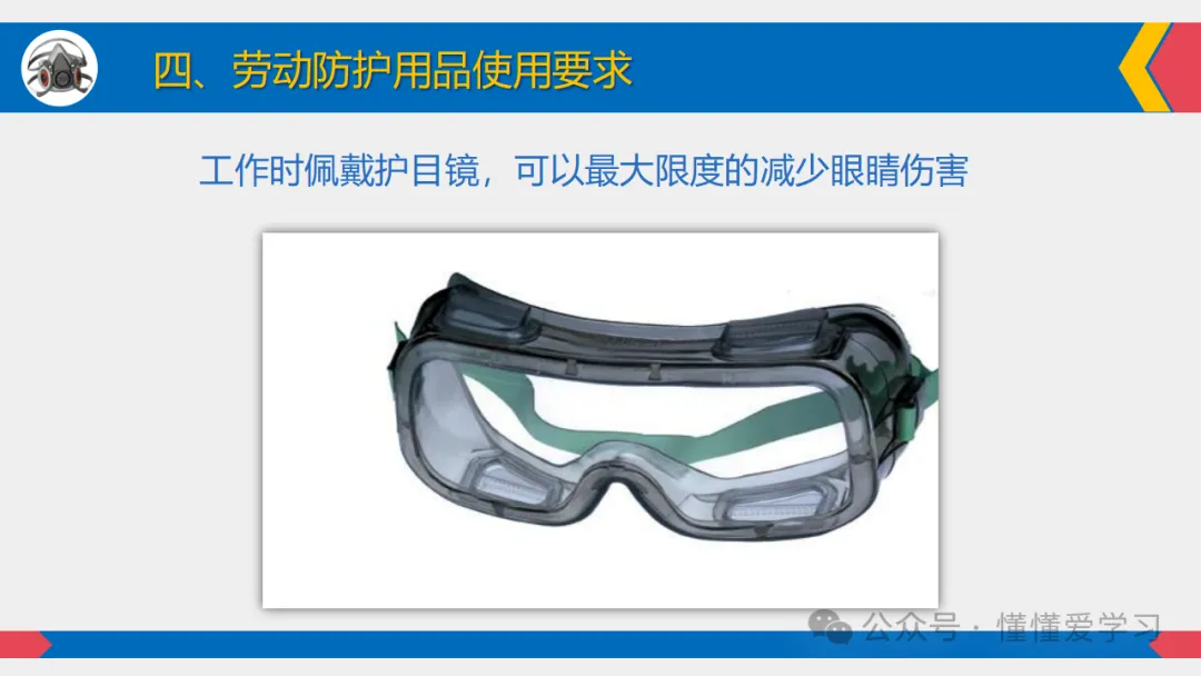 眼面部防护用品用于防御物理和化学危险、有害因素对眼面部的伤害。例如,防护眼镜、眼罩或面罩适用于存在粉尘、气体、蒸气、雾、烟或飞屑刺激眼睛或面部的情况。焊接作业时,应佩戴焊接防护镜和面罩。