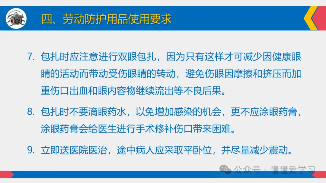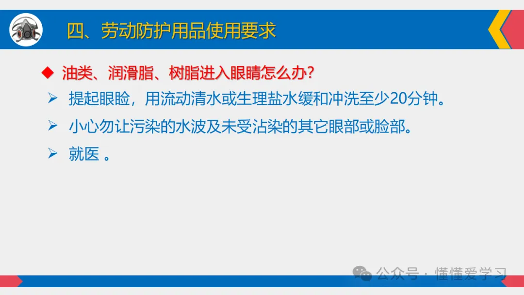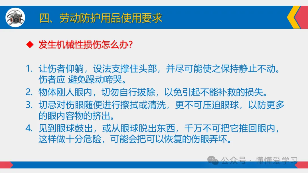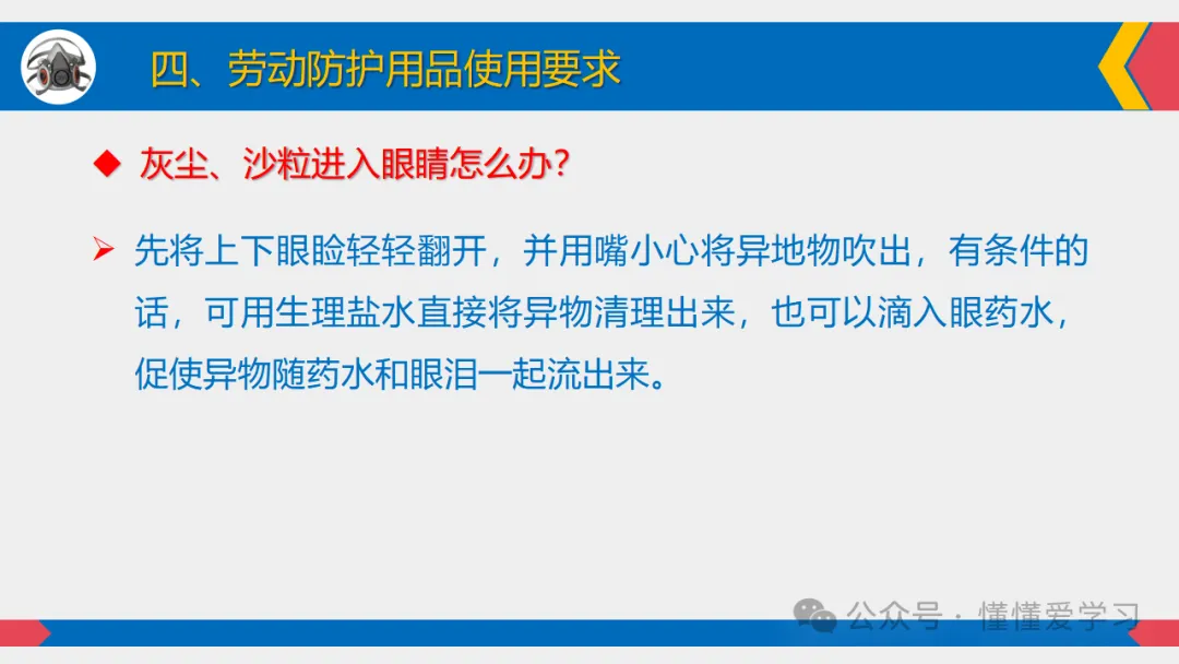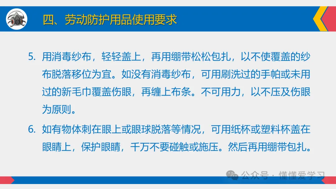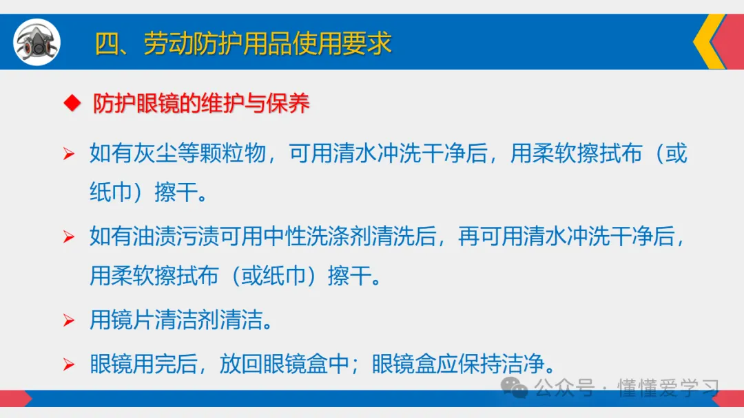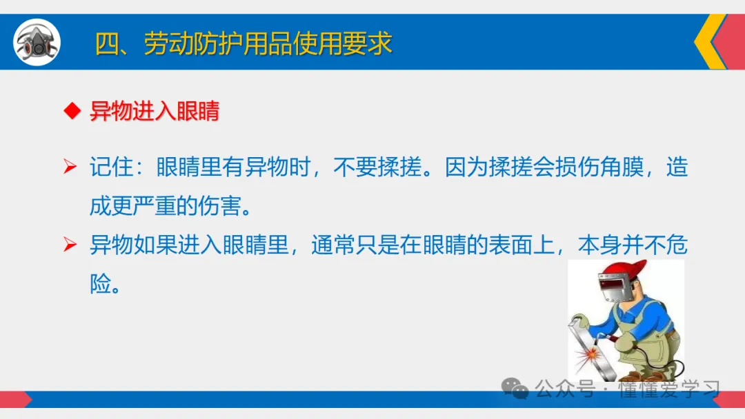 眼面部防护用品用于防御物理和化学危险、有害因素对眼面部的伤害。例如,防护眼镜、眼罩或面罩适用于存在粉尘、气体、蒸气、雾、烟或飞屑刺激眼睛或面部的情况。焊接作业时,应佩戴焊接防护镜和面罩。