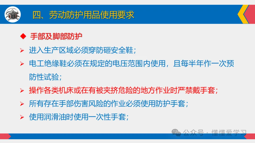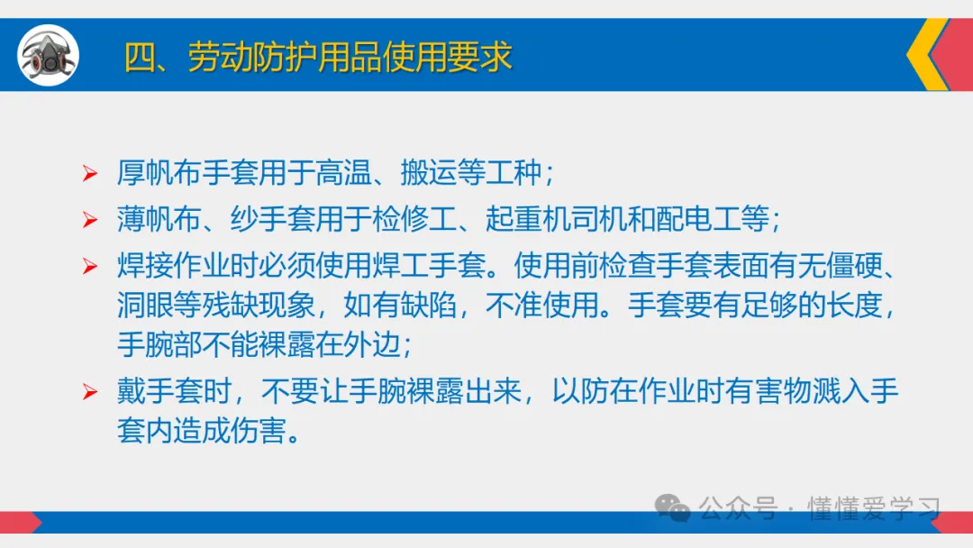 手部防护用品用于防御物理、化学和生物危险、有害因素对手部的伤害。例如,防切割、防腐蚀、防渗透、隔热、绝缘、保温、防滑等手套,适用于不同类型的作业环境。在可能接触尖锐物体或粗糙表面时,应使用防切割手套;在可能接触化学品时,应选用防化学腐蚀、防化学渗透的防护用品。
