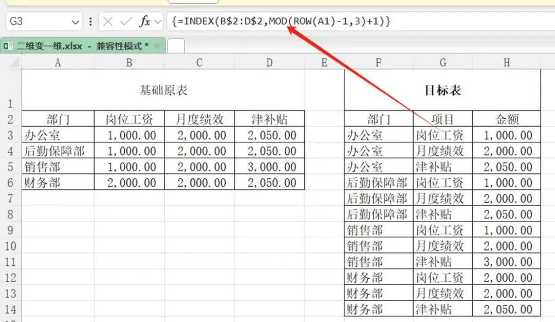 Step 2:在G3录入“=INDEX(B$2:D$2,MOD(ROW(A1)-1,3)+1)”,然后下拉,如图