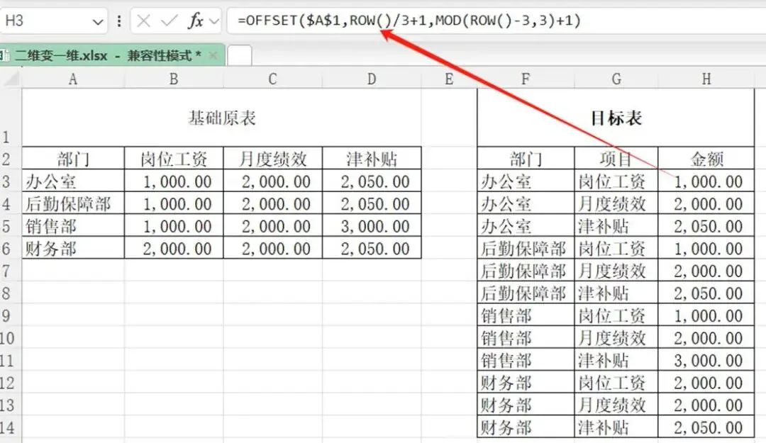 Step 3 :在H3录入“=OFFSET($A$1,ROW()/3+1,MOD(ROW()-3,3)+1)”,然后下拉,如图