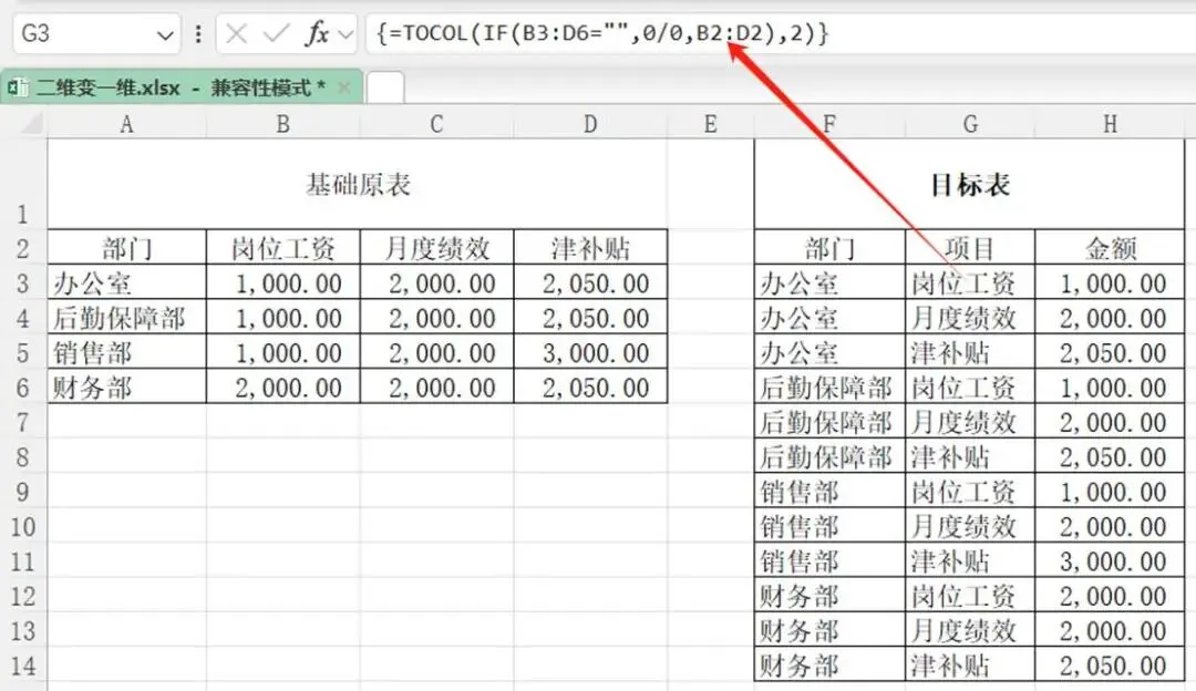 Step 2:在G3录入“=TOCOL(IF(B3:D6="",0/0,B2:D2),2)”