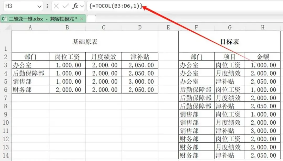 Step 3 :在H3录入“=TOCOL(B3:D6,1)”